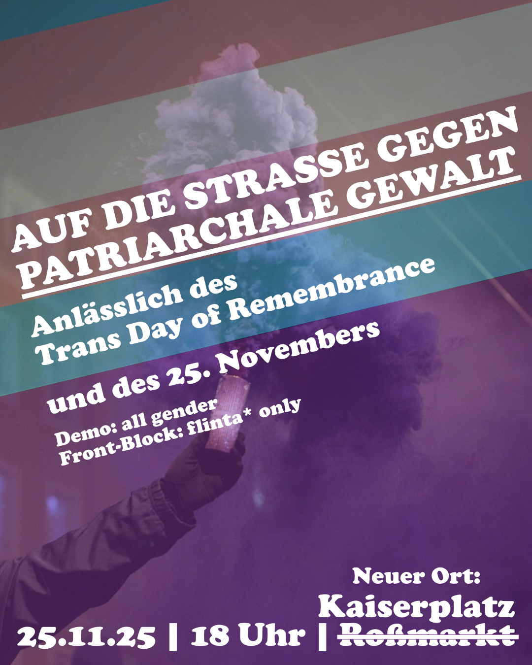 Anlässlich des Trans Day of Remembrance und des 25. Novembers! 25.11.25 | 18 Uhr | NEUER ORT: KAISERPLATZ Demo: all genderFront-Block: flinta* only Gewalt gegen FLINTA*s ist alltäglich und normalisiert: Diskrimierung am Arbeitsplatz, in der Gesundheitsversorgung, bei der Jobsuche, in unseren Familien und auf der Straße, verbale und physische Übergriffe und Femizide und transfeindliche Morde.…
