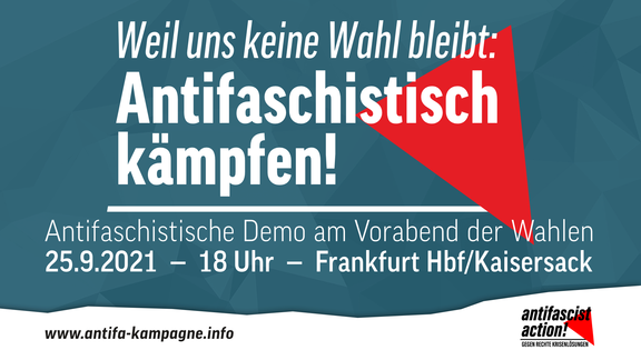 Antifaschistische Demo am Vorabend der Wahlen 25.09.2021 – 18 Uhr – Frankfurt Hbf/Kaisersack In diesem September ist mal wieder Bundestagswahl und alle dürfen ihr Kreuz machen. Die meisten Parteien setzen aber auf unsoziale und autoritäre Krisenlösungen und die letzten Jahre haben deutlich gezeigt, dass die AfD nicht einmal regieren muss, um Staat und Gesellschaft immer…