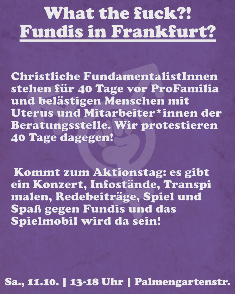 Christliche FundamentalistInnen stehen für 40 Tage vor ProFamilia und belästigen Menschen mit Uterus und Mitarbeiter*innen der Beratungsstelle. Wir protestieren 40 Tage dagegen!