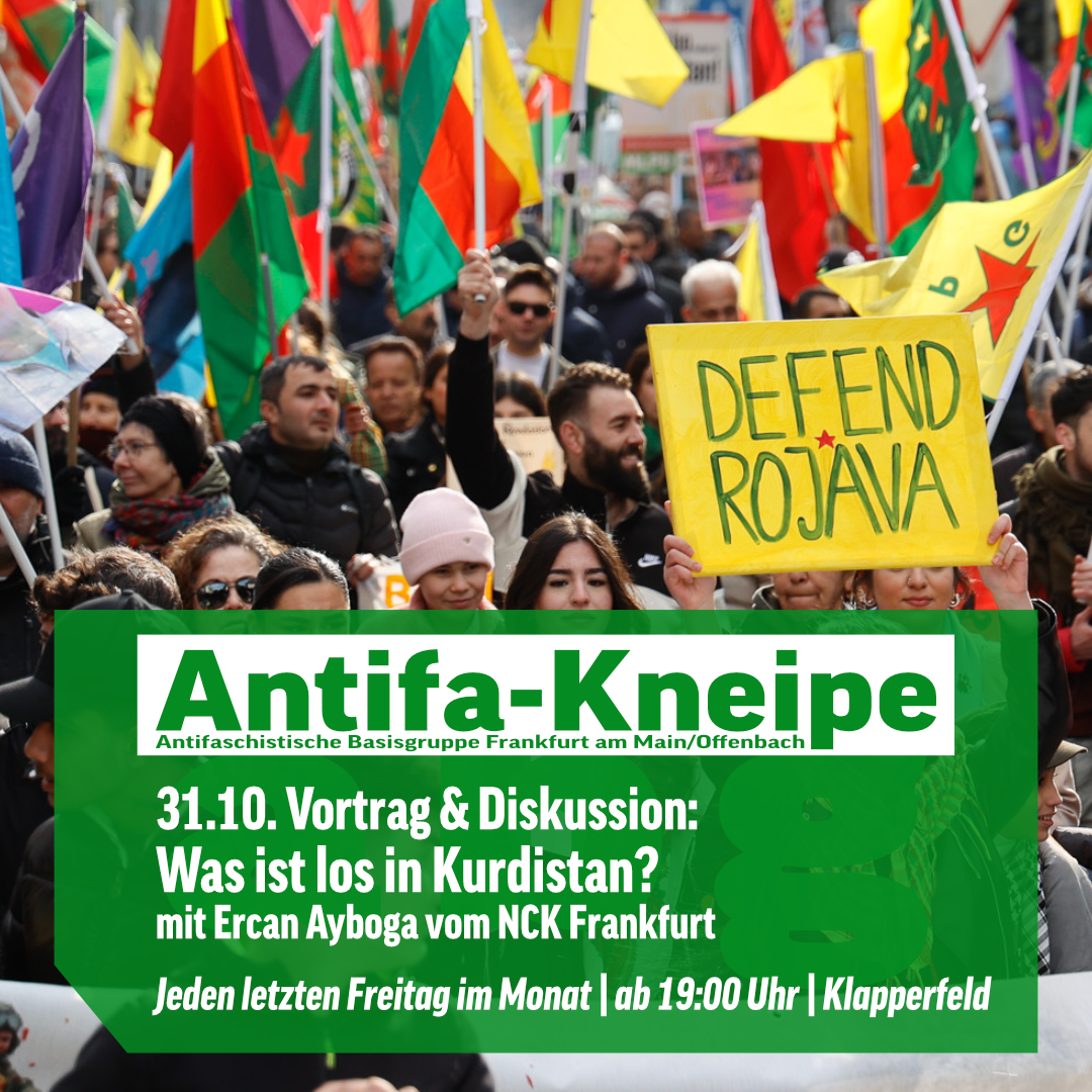 31.10. Vortrag & Diskussion: Was ist los in Kurdistan? Vortrag und Diskussion über die politischen Entwicklungen in Kurdistan, mit besonderem Blick auf Nord- und Westkurdistan (Rojava). mit Ercan Ayboga vom NCK – Kurdisches Gesellschaftszentrum Frankfurt. Seit Ende 2024 tut sich politisch viel in und um Kurdistan, als der türkische Staat Verhandlungen mit der kurdischen Freiheitsbewegung…