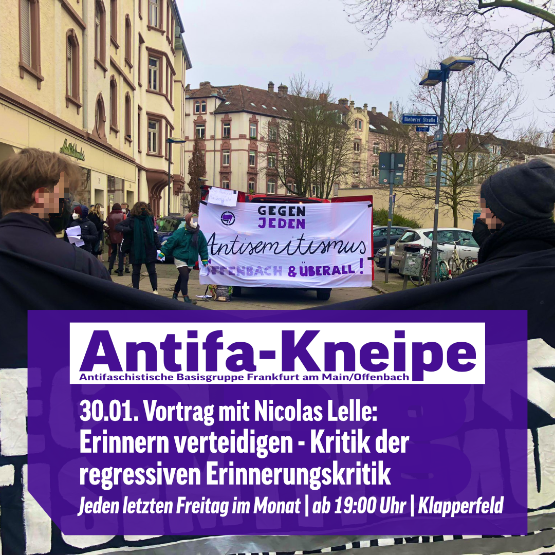 30.01. Vortrag & Diskussion: Erinnern verteidigen. Kritik der regressiven Erinnerungskritik. mit Nikolas Lelle Die Erinnerung an die Verbrechen des Nationalsozialismus wird angegriffen. Gedenkstätten berichten seit Jahren von zunehmenden Sachbeschädigungen und Übergriffen, Stolpersteine werden verätzt oder herausgerissen, Mahnmale beschmiert. In der Mehrheit der Fälle sind Rechtsextreme dafür verantwortlich. Höckes erinnerungspolitische Wende um 180 Grad wird in…